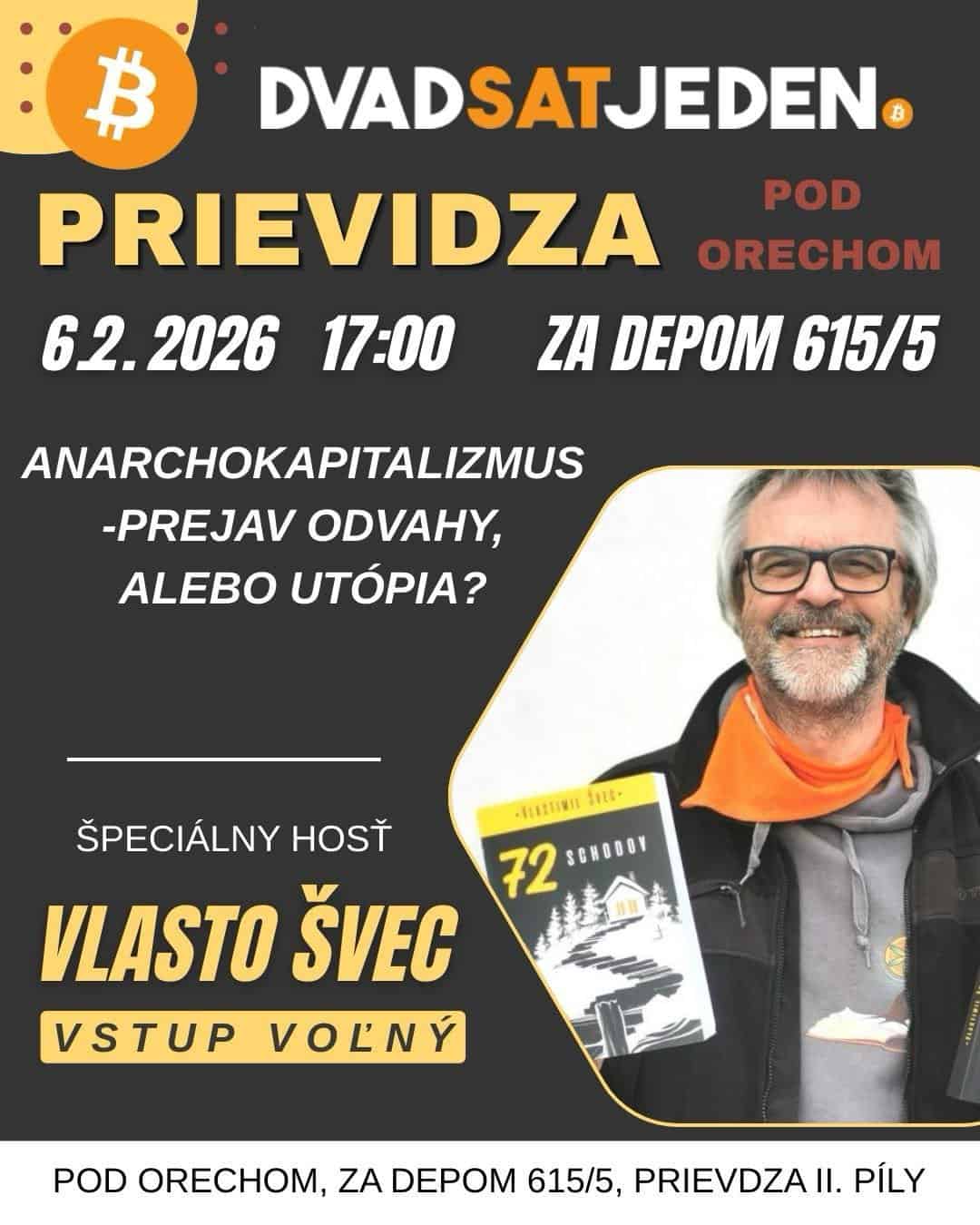 Anarchokapitalizmus je myšlienkový smer, ktorého základným prvkom je dobrovoľnosť konania. Vychádza z rakúskej ekonomickej školy a praxeológiou dokazuje, že dobrovoľné interakcie medzi ľuďmi sú oveľa efektívnejšie ako štátne regulácie. Počas prednášky si povieme základné prvky anarchokapitalizmu a môžeme si aj modelovať ako by niektoré segmenty riešil trh, ak by nebol v štátnej správe. Napríklad zdravotníctvo, či financie.