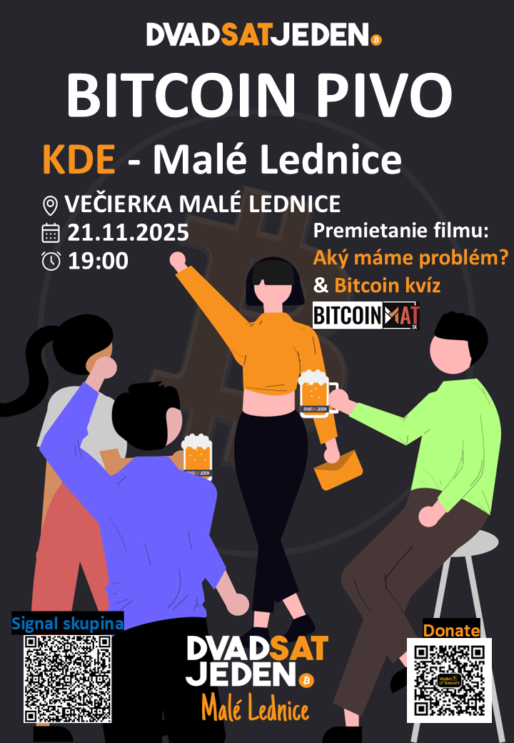 DVADSATJEDEN Malé Lednice a miestna Večierka Vás pozývajú na BITCOIN PIVO 21.11.2025 (piatok) od 19:00, v rámci ktorého si pozrieme film “Aký máme problém?“ a potom sa zapojíme v rámci Slovenska do Bitcoinového kvízu. V súťaži sa hrá o 150 EUR, 100 EUR a 50 EUR pre komunitu od bitcoinmat.sk