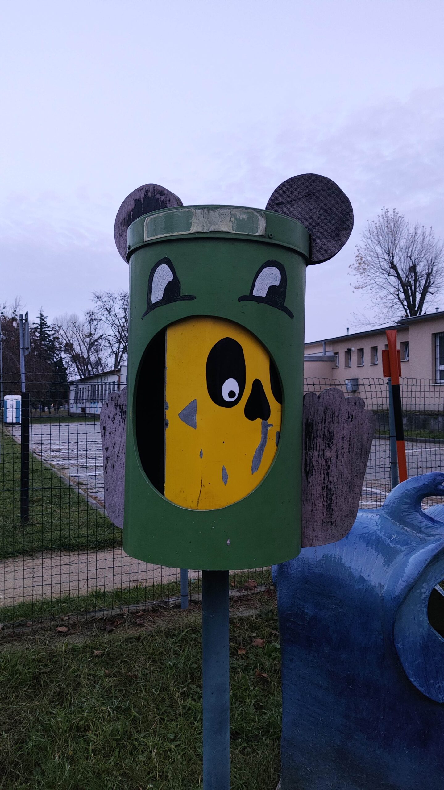 Knihobúdka sa nachádza v areáli detského ihriska. Pri vchode na pravej strane. Plechová a nafarbená na zeleno na nejakú príšerku :)