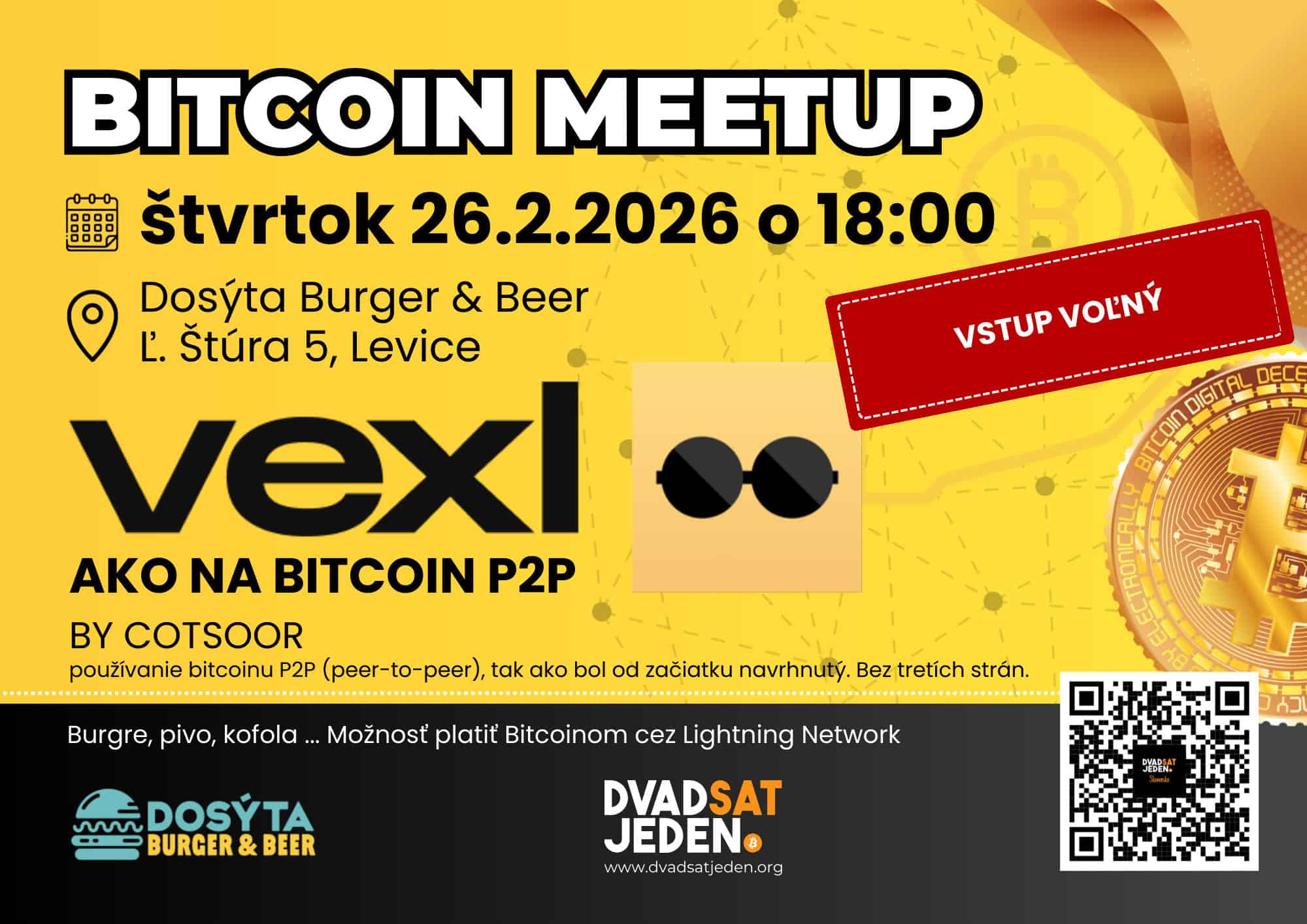 Tentokrát privítame rečníka až Bratislavy. Cotsoor nám porozpráva o aplikácii vexl z dielne SatoshiLabs (o.i. vyrábajú aj Trezor) a pobavíme sa o návrate k peer-to-peer obchodovaniu - možnostiach, úskaliach, výhodách. Vstup je voľný a každý je vítaný