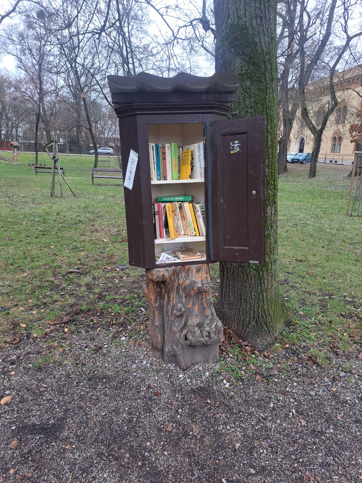 V mestskom parku hĺadajte hnednú knihobúdku zavesenú na strome.