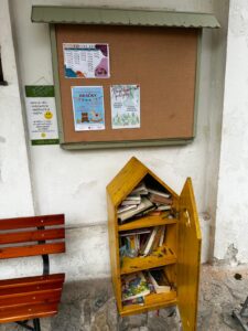 Búdka pred budovou Centra voľného času, detské knihy.
