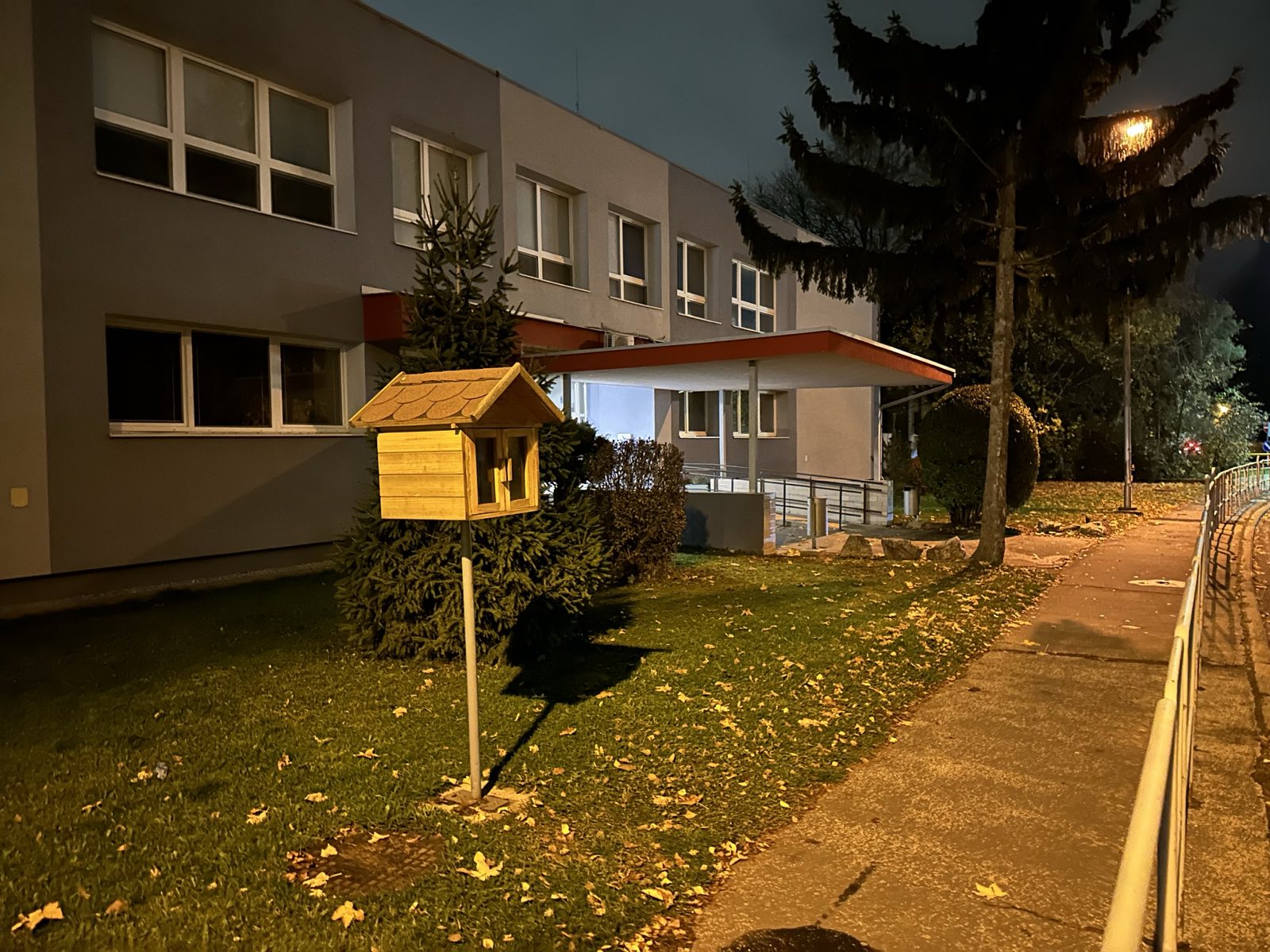 Knihobúdka na nachádza priamo pred areálom školy (Nábrežie mládeže 1)