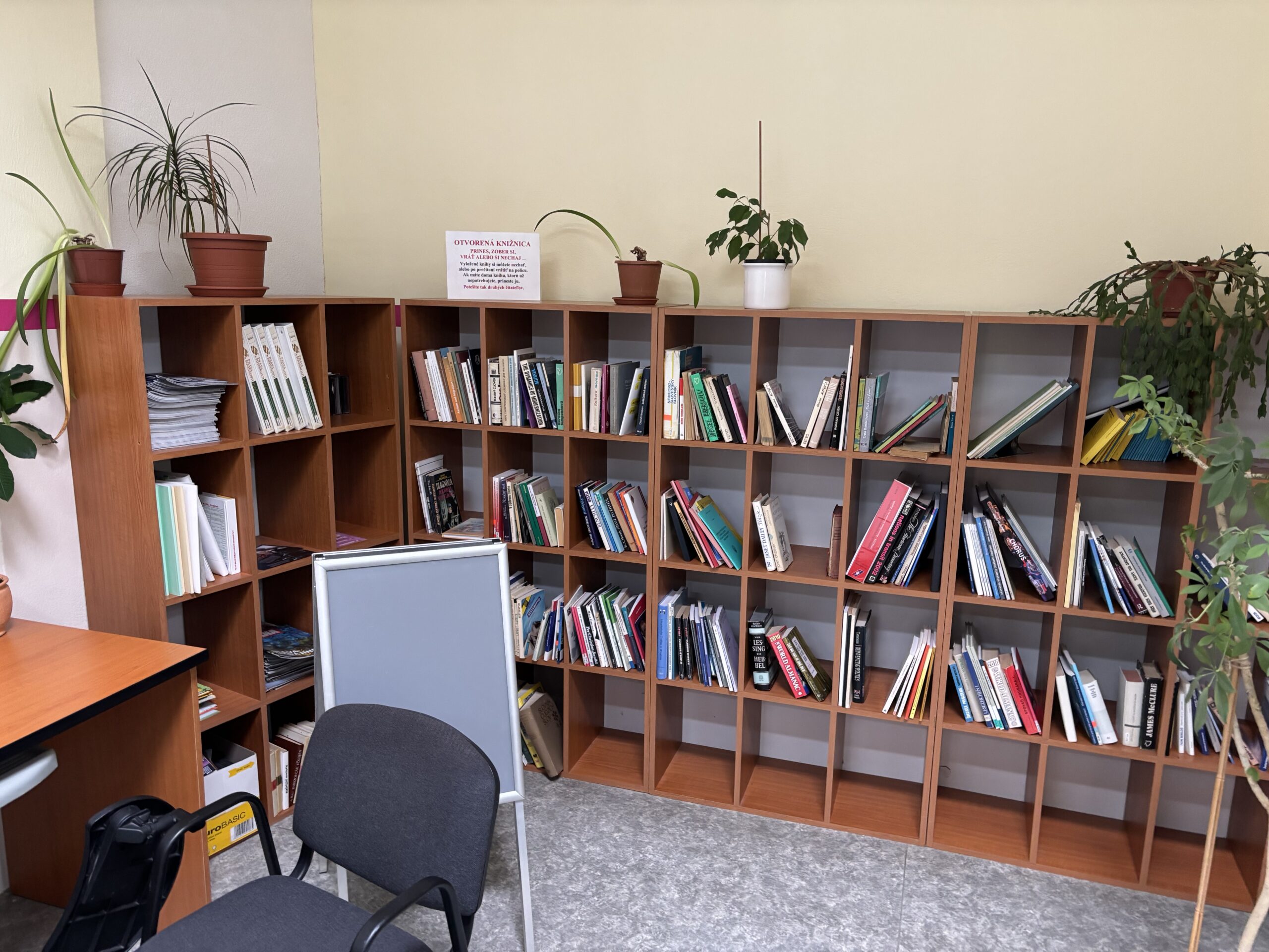 hneď vo vstupnom priestore knižnice (na poschodí)